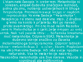 | ŽIVLJENJA | Listam neki časopis i pročitam: Melankolija nije bolest nego prekrasna karakterna osobina puna dubine, unutarnje kreativnosti i tihe čežnje. Pospremam svoje knjige i nađem reprodukciju Maksima Sedeja Melankolija. Zalepim je na zid iznad radnog stola. Sa porodicom idemo na ručak k prijatelju. Kao obično prelistavam knjige. Kod nekog našeg filozofa čitam: Melankolija je objekt želje okraden za svoj uzrok. Neki naš pesnik citira: božanska kreativna moć melankolije. Otvorim rečnik slovenskog književnog jezika: Melankolija je duševno stanje značajno za čoveka melankoličnog temperamenta. Otvorim latinski rečnik: melancholicus 3 - tužan, jadan. Pogledam na sliku Maksima Sedeja. Kćerka piše svoje priče u kompjutor. Sva ta melankolija naokolo. Bezkonačna melankolija sve žive prirode. Svemir i stvarnost su indiferentni. | |||